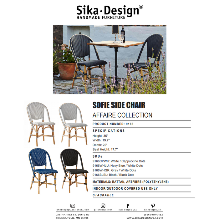 The Sofie is a modern update of a classic French caf̩e or Paris bistro chair and can be found in upper end cafes, brasseries, bistros and restaurants in historical European cities and capitals throughout the world. The Sofie chair is a favorite among restaurants and cafes because of its durability and how well it stacks.