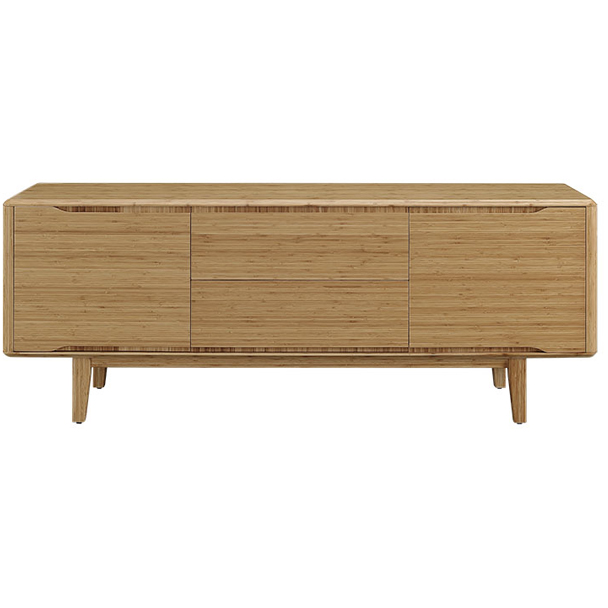 The Currant sideboard/ media cabinet features a center drop down door for media access, with cord management. Directly below, the solid bamboo drawer is constructed using English dovetail joinery, and soft-closing, under mount drawer glides. On each side are two adjustable storage shelves behind closed doors. Finishing the look are sleek recessed pulls, and handsomely shaped legs which taper towards the floor.