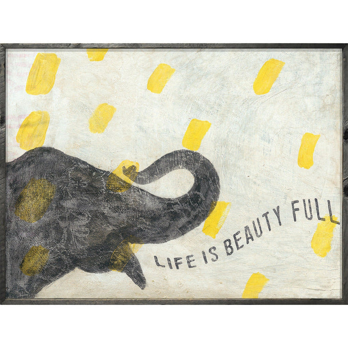 A black and yellow-splotched elephant surrounded by yellow shapes. This “smart” elephant shouts a wonderful reminder, a popular belief of Sugarboo & Co.: “life is beauty full!” A rustic, unique alternative to our colorful “Pink Elephant” print.