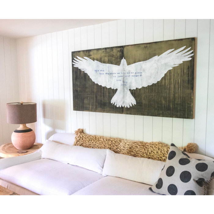 Inspire the hearts and minds of all who see it in your home. The message reads, "This sky, This sky where we live is no place to lose your wings so love, love, love"