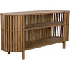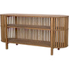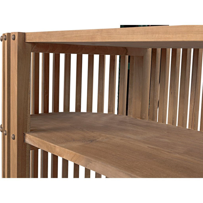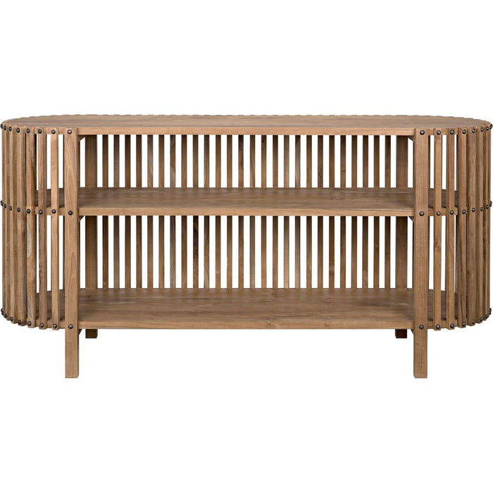 Subtly tropical and substantially stylish, this teak console has a natural finish that allows the woodÕs beauty to shine. Nailheads add interest to the curved sides and middle shelf and reach all the way around the fully finished piece.